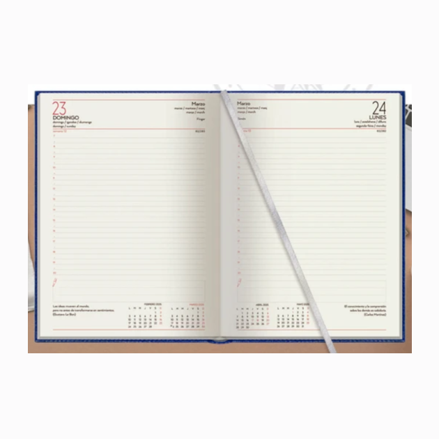 Podrás personalizar tu agenda con un diseño sencillo que tu prefieras, o una frase inspiradora para el año o el logo de tu empresa. Si quieres añadir tu logo o tienes una idea de diseño particular no dudes en contactar con nosotros y te ayudamos.