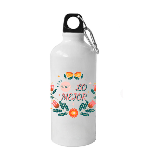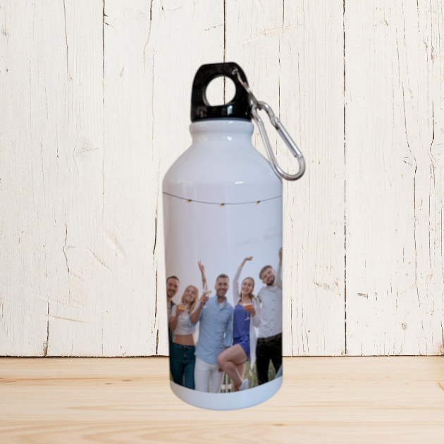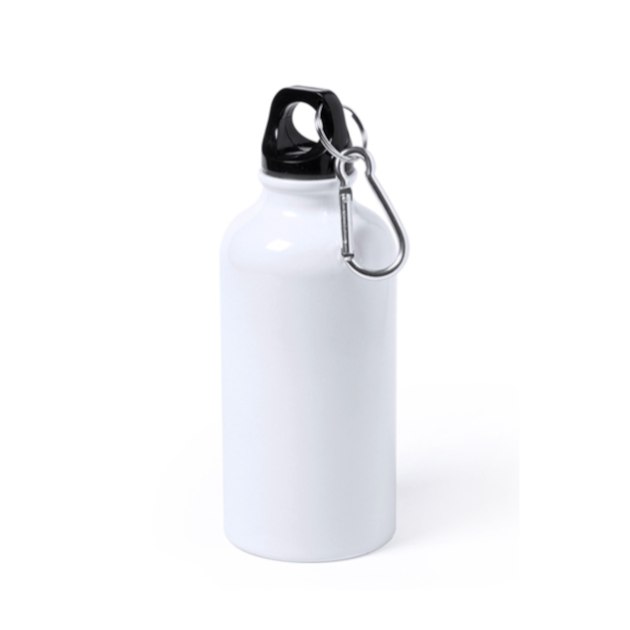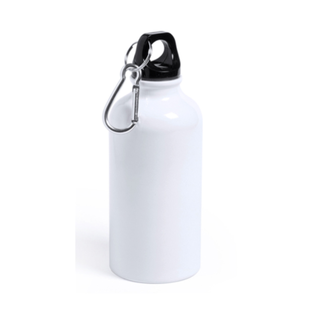 Preciosa Botella Aluminio 420 ml de color blanca para que la puedas personalizar con la técnica de la sublimación. Perfecta para viajes gracias a su robustez y ligereza. Incluye tapón de plástico de alta seguridad para evitar la pérdidas de líquidos y mosquetón de sujeción para la botella a la mochila, pantalones, etc.