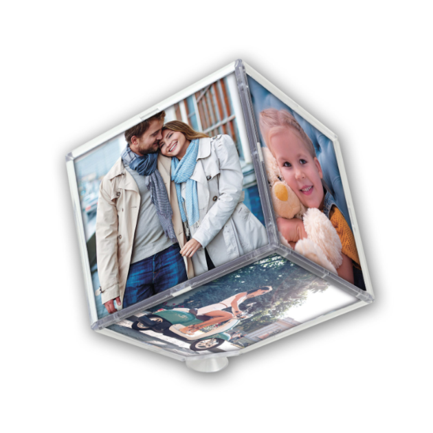 El Cubo acrílico automático 15x15cm para 6 fotos es un original fotocubo acrílico giratorio, acabado transparente, para 6 fotos, ideal para exponer tus fotos favoritas, útil y original idea de regalo.