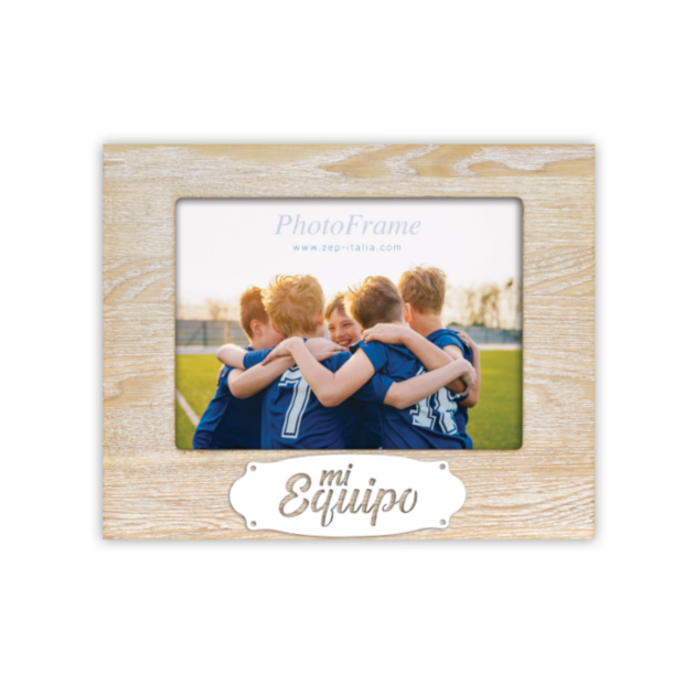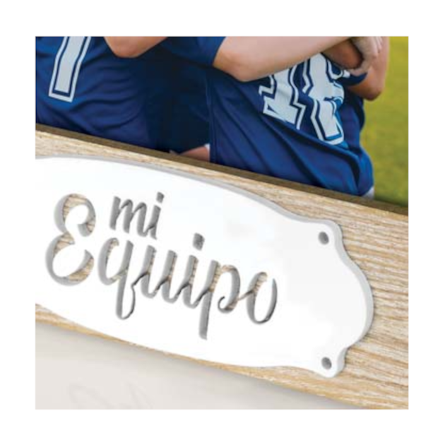 Nuestro MARCO Mod. Equipo 10×15 es un original marco de color madera natural y blanco, con placa decorativa en relieve, con la escritura EQUIPO perforada, perfecto para colocarlo sobre la mesa. Ideal para poner la foto de tu equipo deportivo, para fotos de grupo, idea de regalo original, apto como regalo para eventos deportivos.