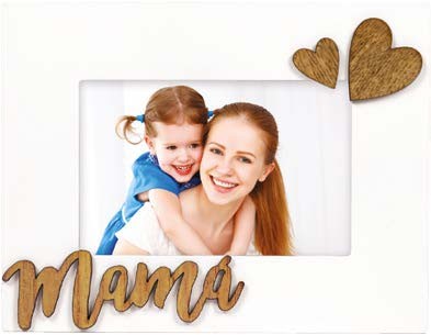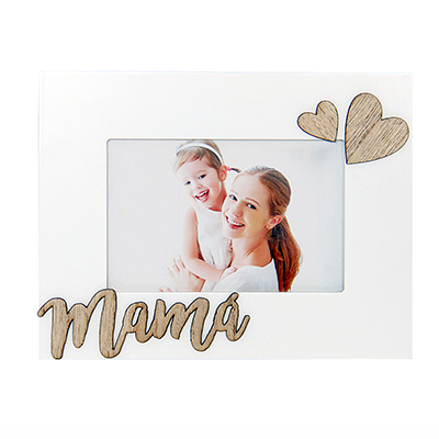 El Marco Mod. Mamá 10×15 de IBIS es un precioso marco de madera de color blanco, con inscripción MAMA en relieve y decoración 3D en forma de corazón, versión de mesa.