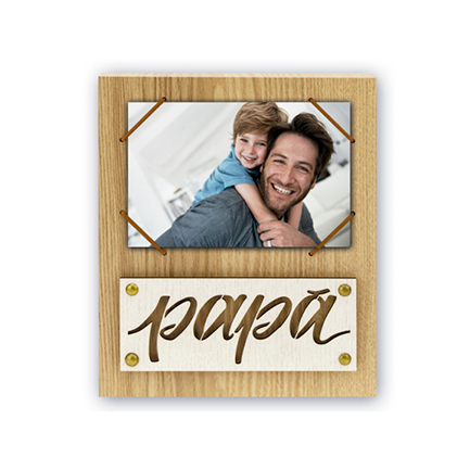 El Marco Mod. MAURO 10X15 es para fotografía horizontal, de madera, sin cristal , la foto se sujeta por las cuatro esquinas. Abajo tiene la palabra “Papá”.