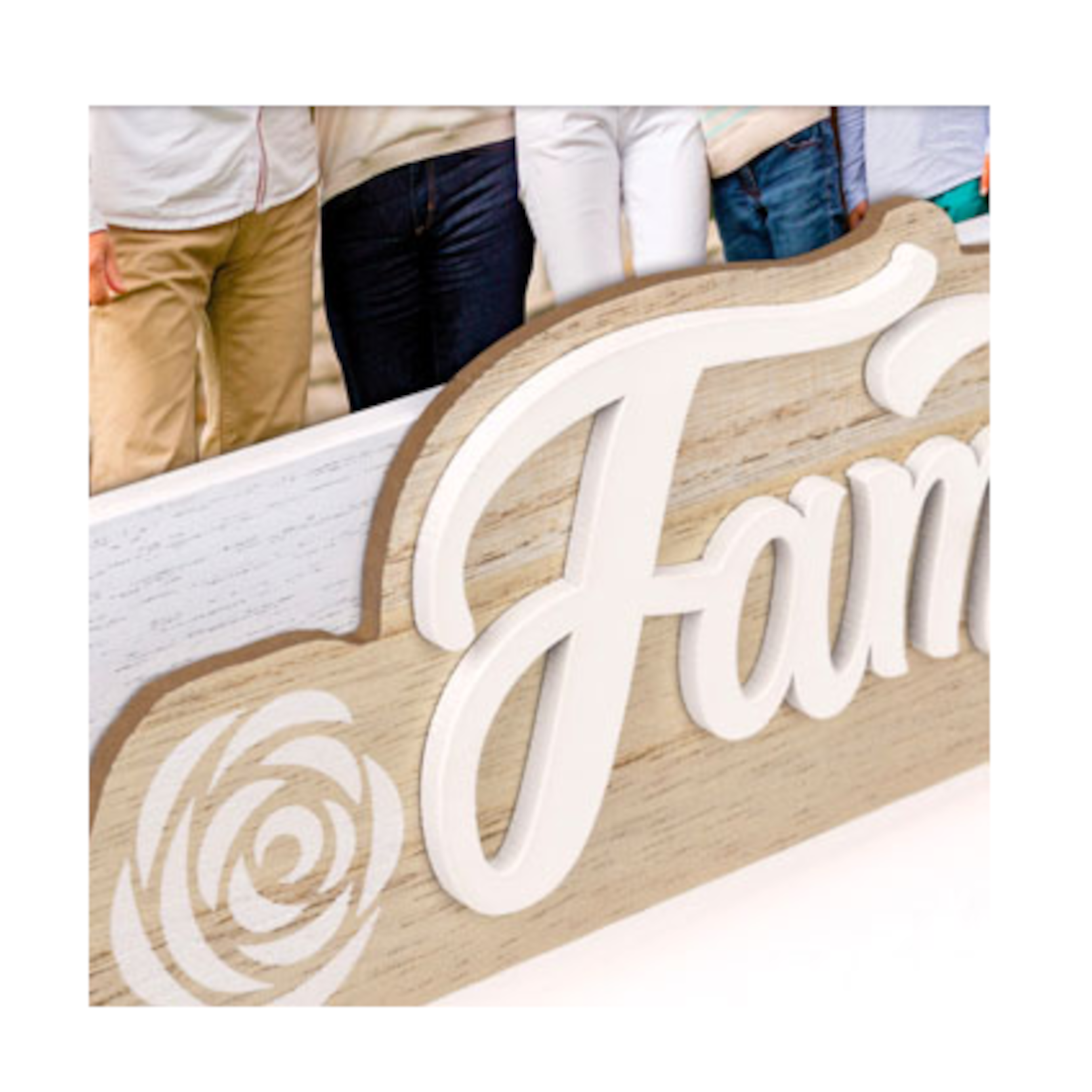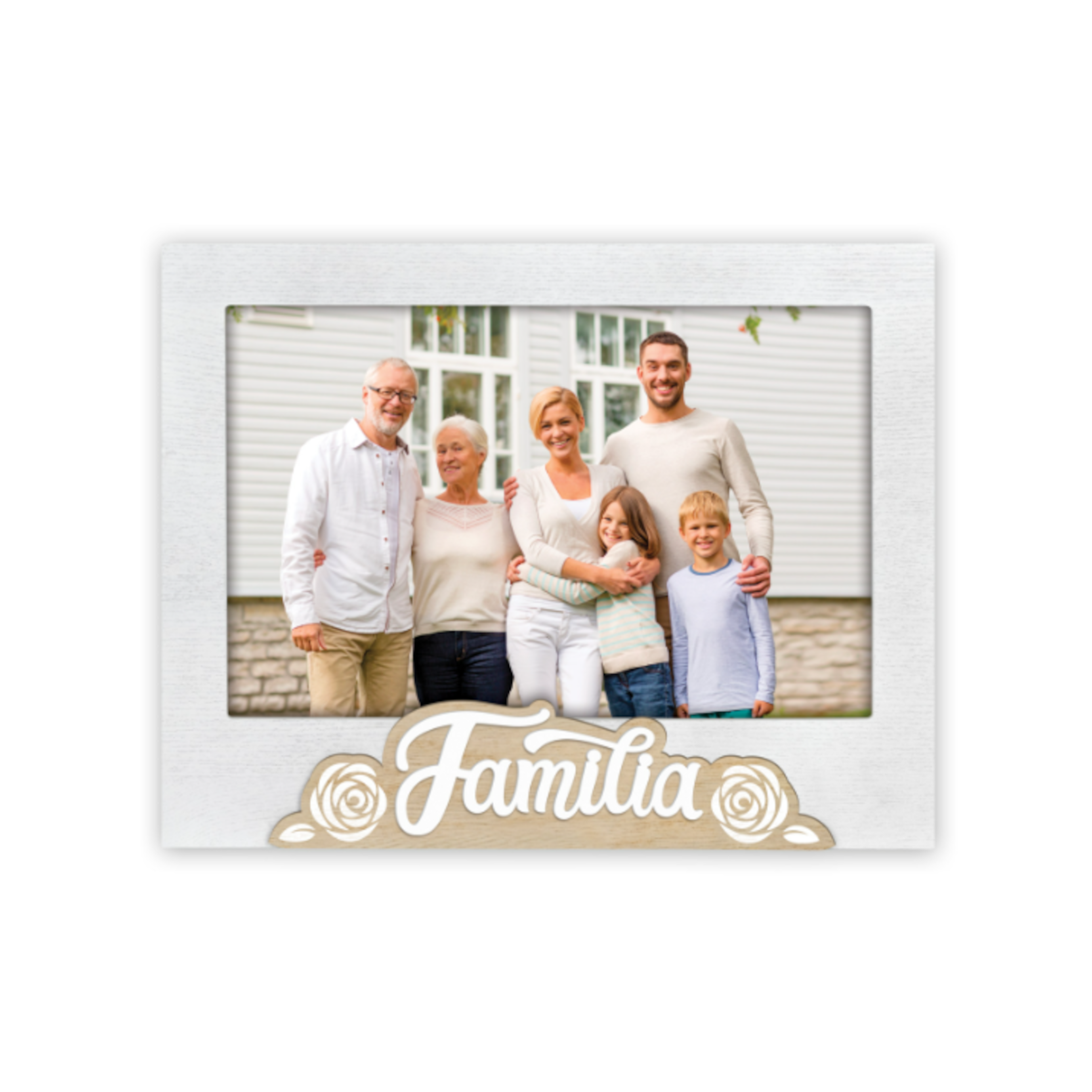 El Marco Mod. Reina es un precioso marco en madera, blanco y marrón, con escritura FAMILIA en relieve y decoración impresa en forma de rosas, perfecto para colocarlo sobre la mesa o para decorar la pared.