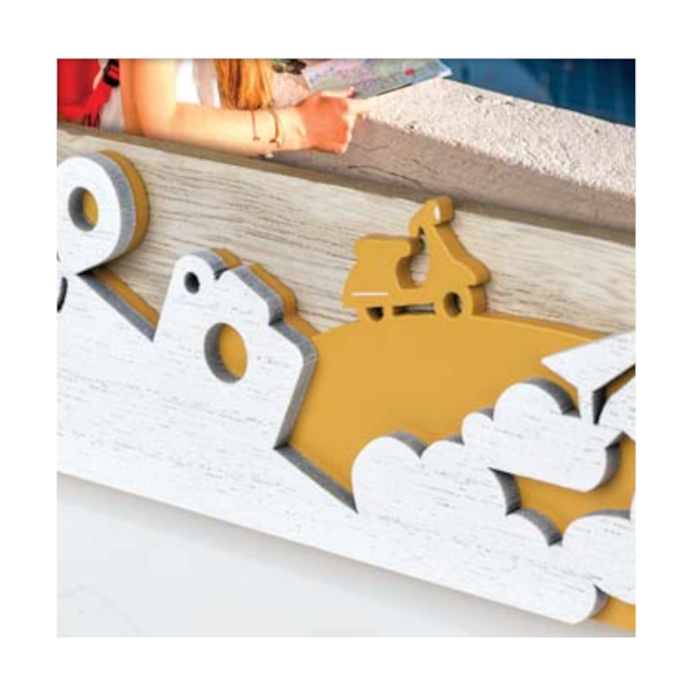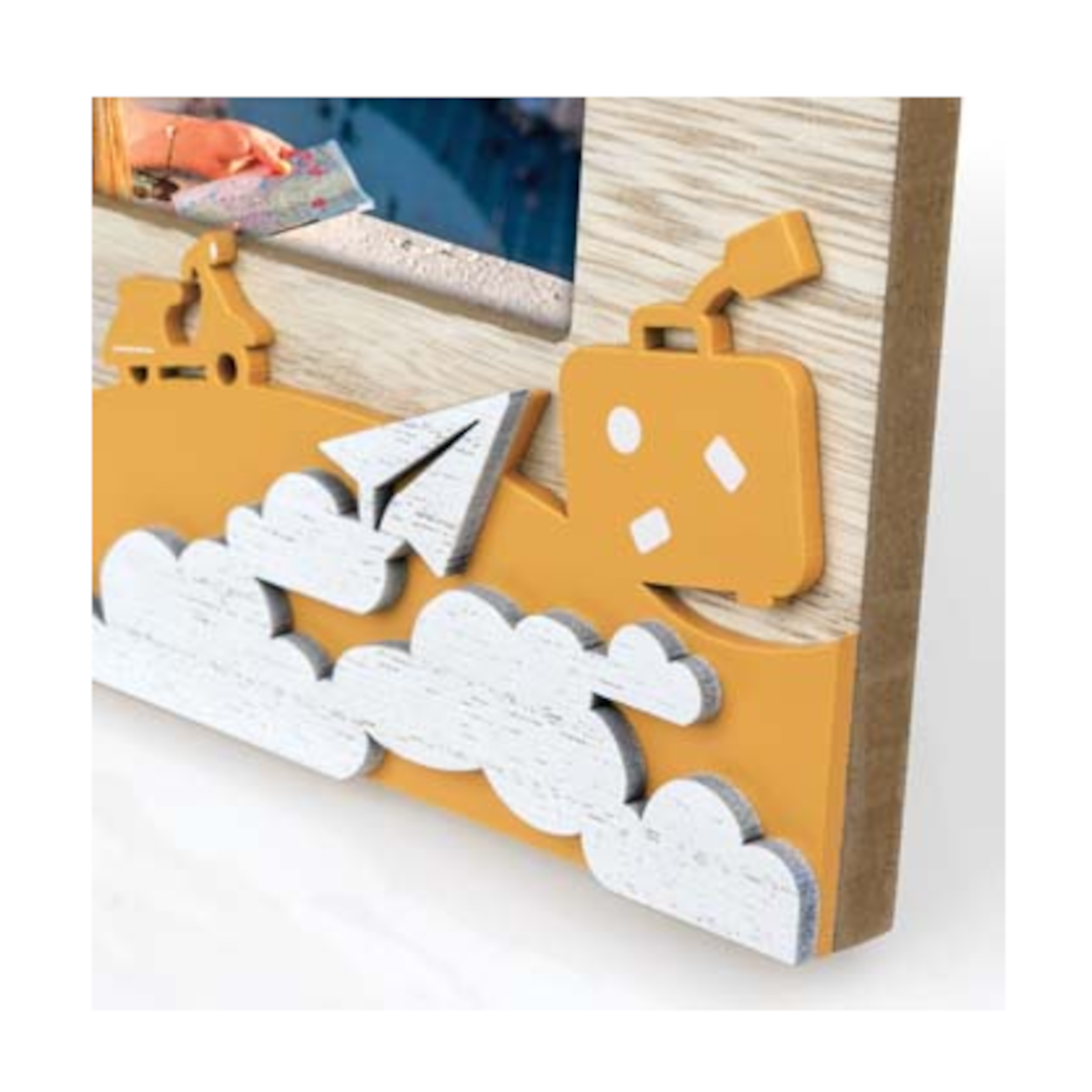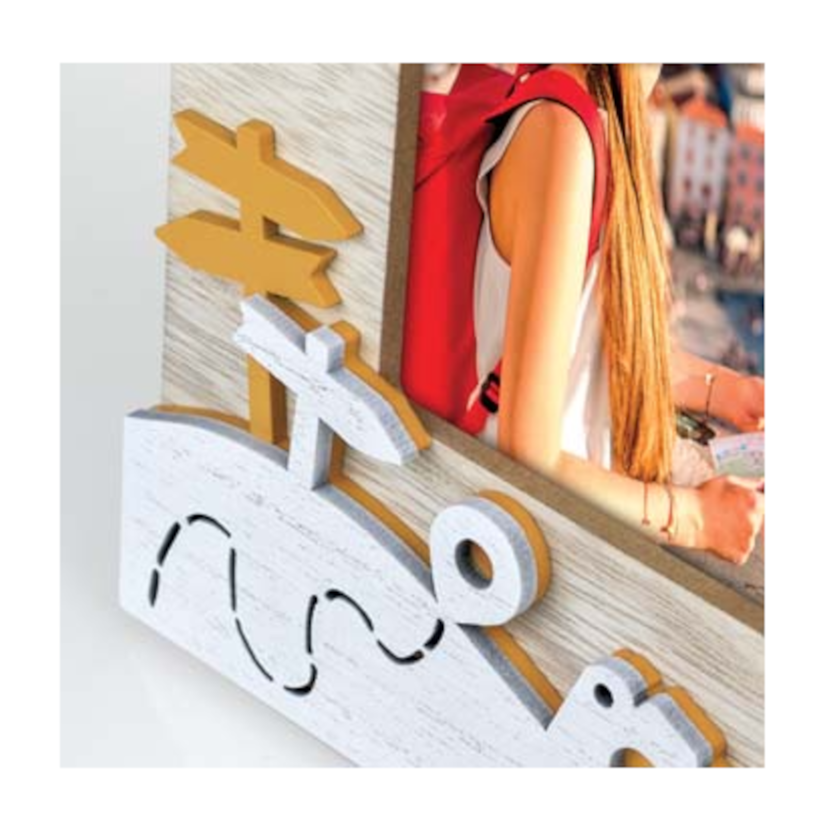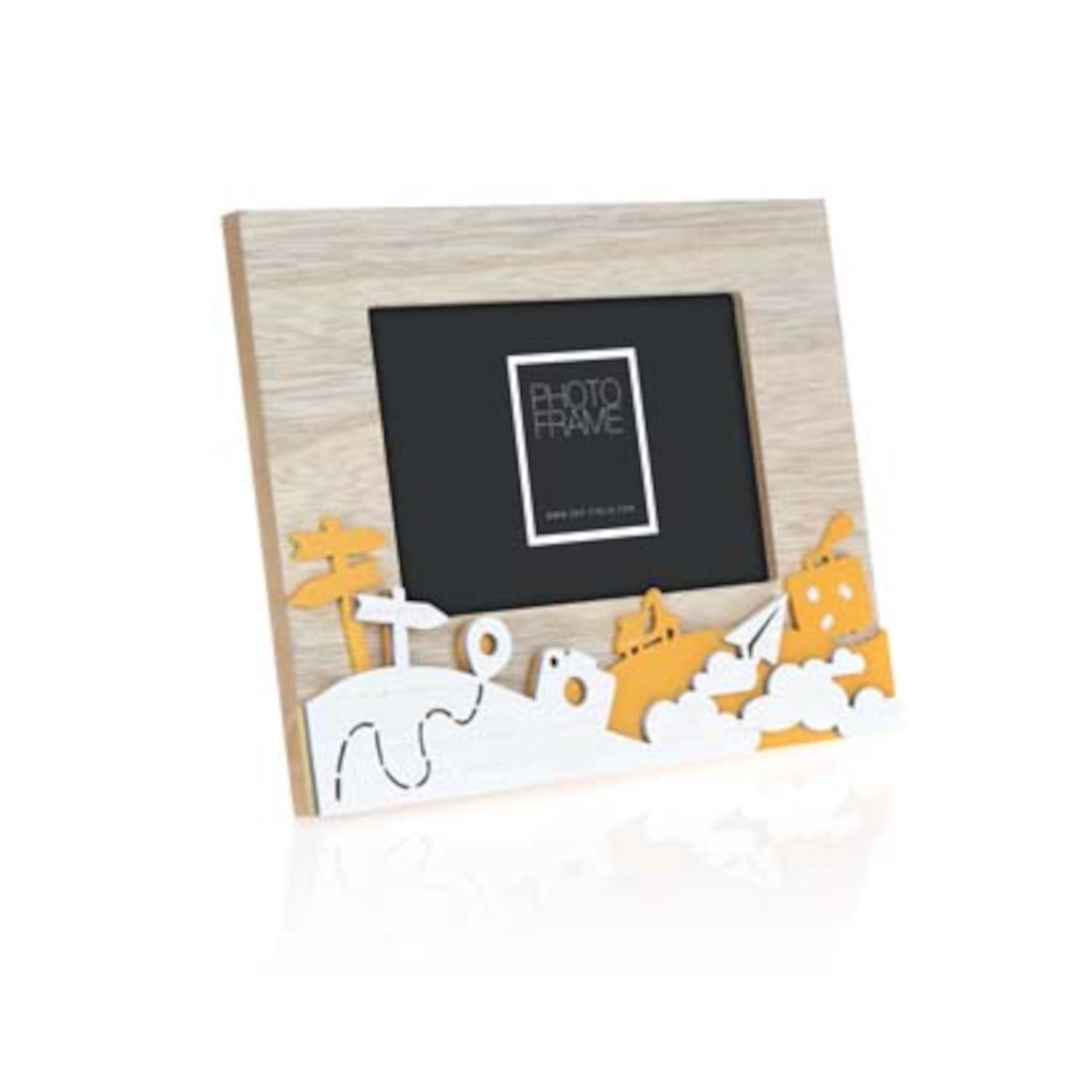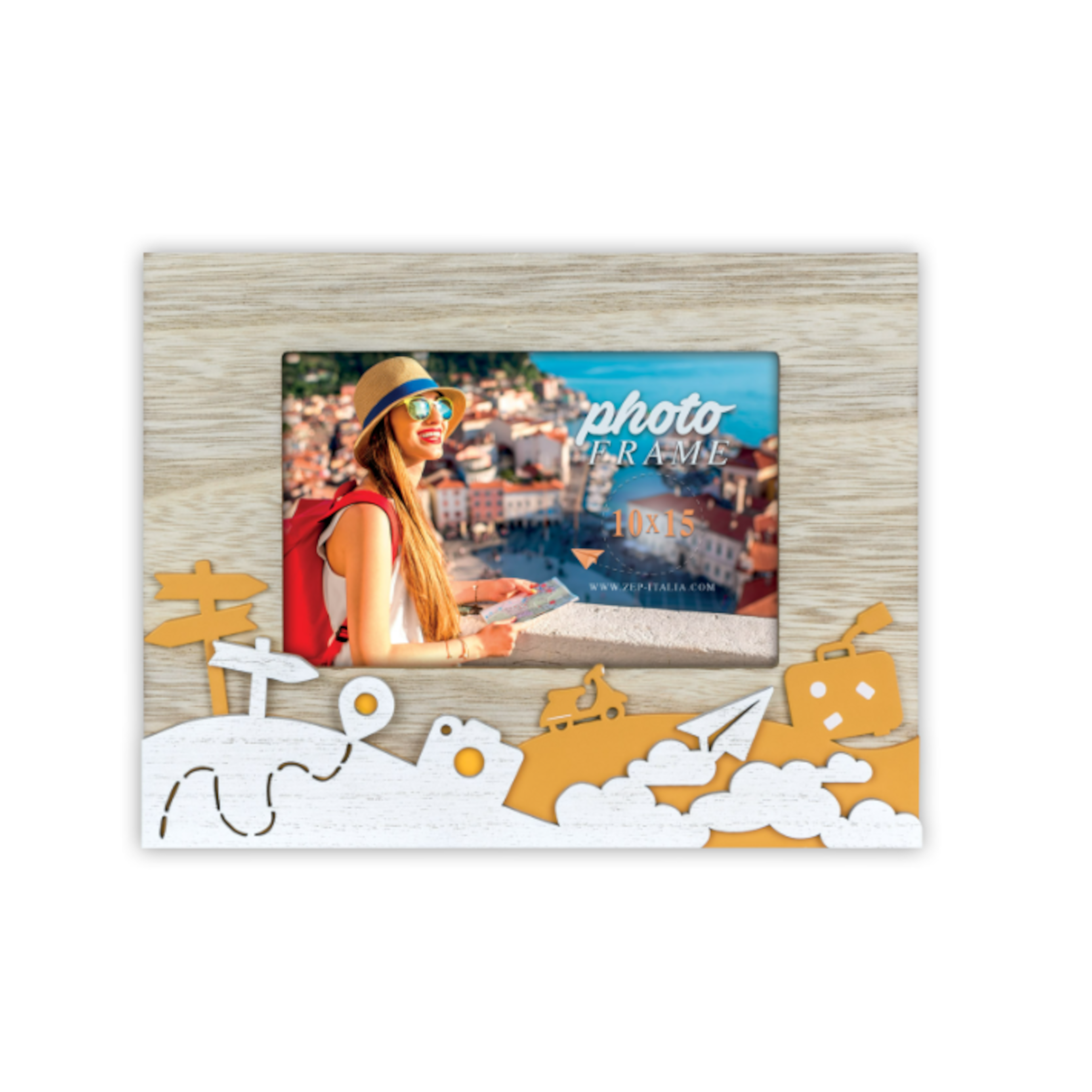 Nuestro MARCO Mod. SOAVE 10×15 es un precioso marco de madera, de color natural, blanco y amarillo, con una decoración temática de viajes. Ideal para colocarlo sobre la mesa. Perfecto para regalar como recuerdo de ese viaje tan especial. Además no solo podrás agregar tu foto favorita, podrás incluso agregarle texto, dibujos… ¡no hay límites para tu imaginación!