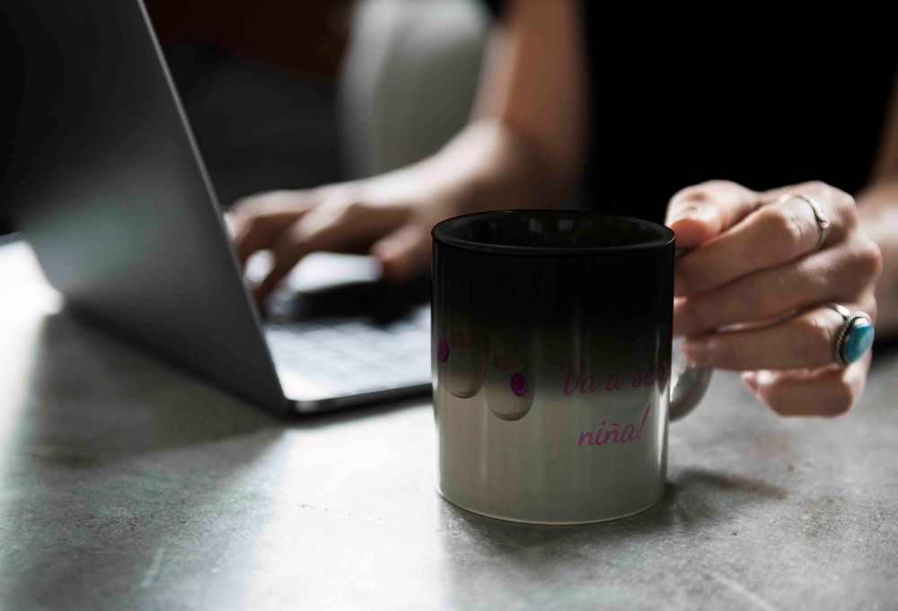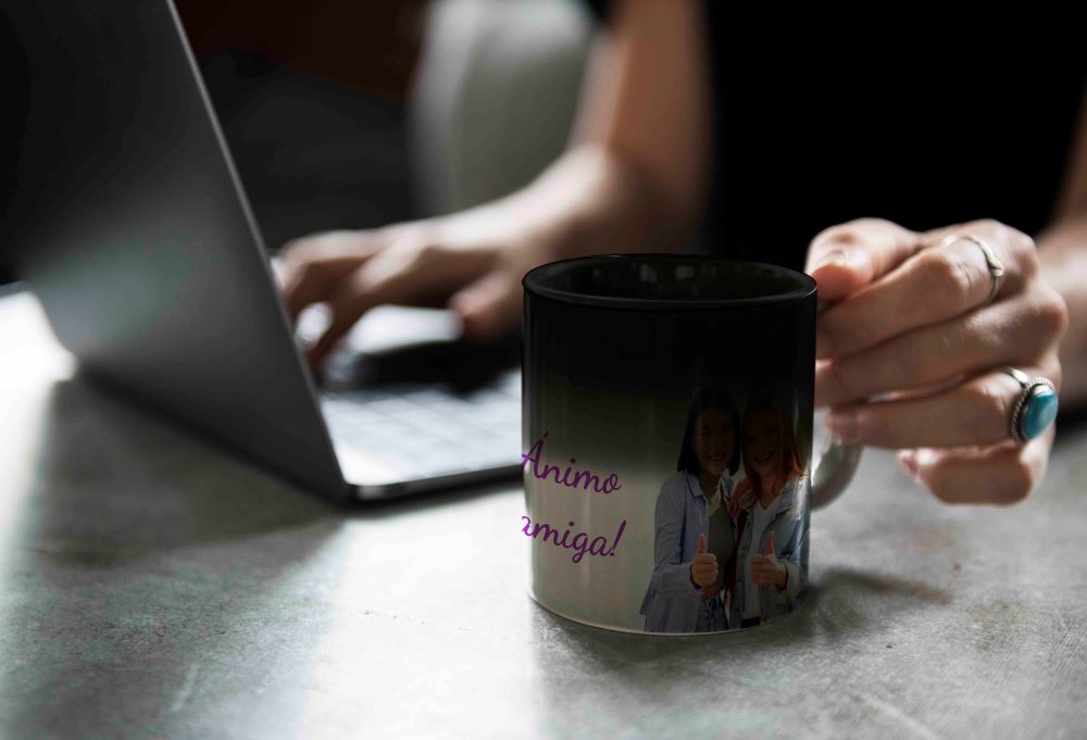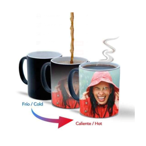 - Termocrómica, es decir, cambia de color con la temperatura. El color negro desaparece gradualmente cuando se llena de líquido caliente, dejando ver la imagen sublimada, y vuelve al color inicial cuando se enfría, ocultando la imagen.